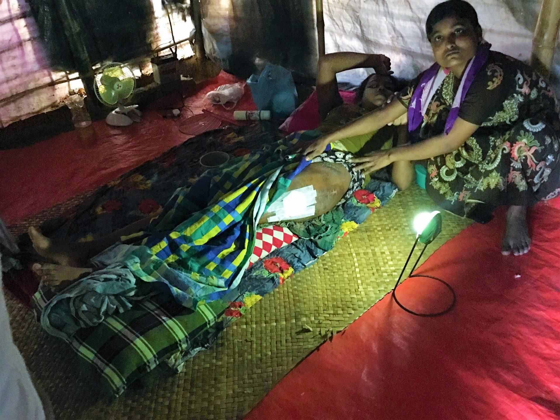 小屋の中で横になるハリダさんと母親難民キャンプ