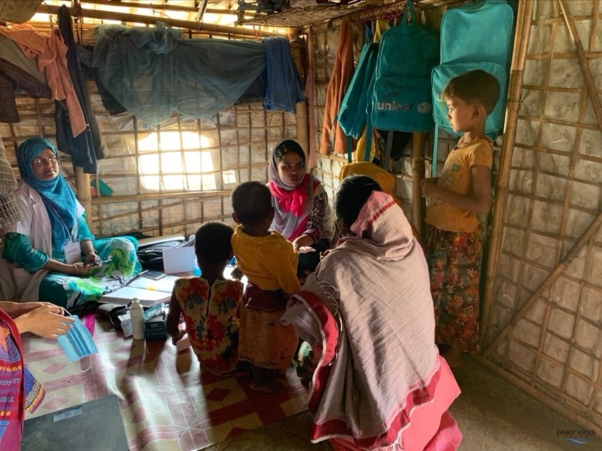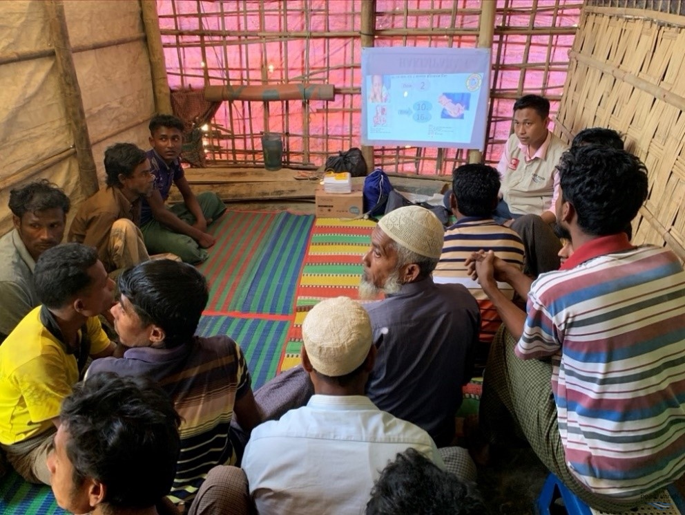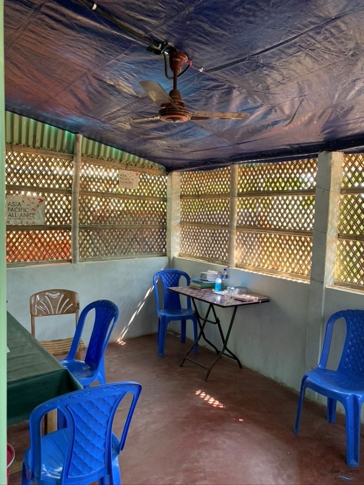 今回は毎週実施している診療所全スタッフが参加する全体会議に参加し、感染症の講義、感染防御の知識の復習、診療データ実績の報告をしました。そして、前回訪問時にトリアージ(患者を状態に応じて優先順位をつけて対応すること)の概念を診療所に導入したため、その確認を再度行いました。また、別枠でロヒンギャの伝統的産婆(Traditional Birth Attendants (TBA))にも個別にトリアージに関するレクチャーを行いました。診療所内では患者の整理や診療所の掃除など、さまざまな業務を手伝ってくれている彼女達は、男性を含めた大人数の集会ではあまり発言をしません。少人数で別室にて時間を設け、トリアージと感染症の疑いがある患者の隔離の必要性を説明し、質疑応答に答えました。少人数で話すと、彼女たちは非常に多く発言をしてくれ、よく理解していたと思います。また、若い医師の横で診察風景をみている際、特に健康状態が悪いわけではない子供のために薬をもらおうとする母親に、丁寧に薬が必要ない旨を説明している姿をみることができました。不必要な薬剤処方を慎むよう時間をかけて指導していた取り組みが実践されているのをみることができ、嬉しい限りでした。