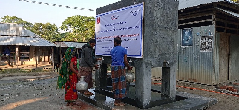 また、サイクロンによる高潮や泥水の侵入により、いままで使用していた井戸水が汚染され使えなくなってしまっていました。そこで、PWJは清潔な水を確保できるようにするため新たに深井戸を2基建設しました。清潔な水を確保することは感染症予防の観点からも非常に重要です。深井戸ができたことで水を汲みに遠くまで歩く必要がなくなり助かった、と人々からは喜びの声が上がりました。