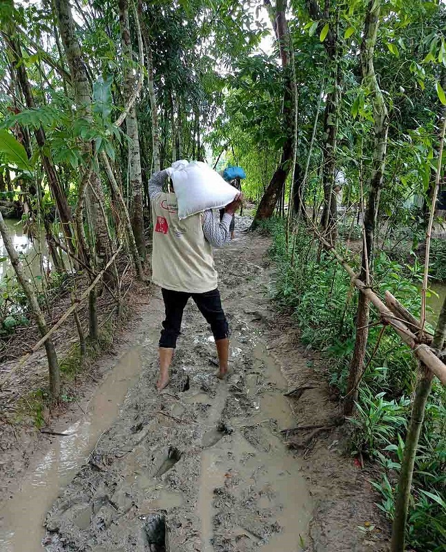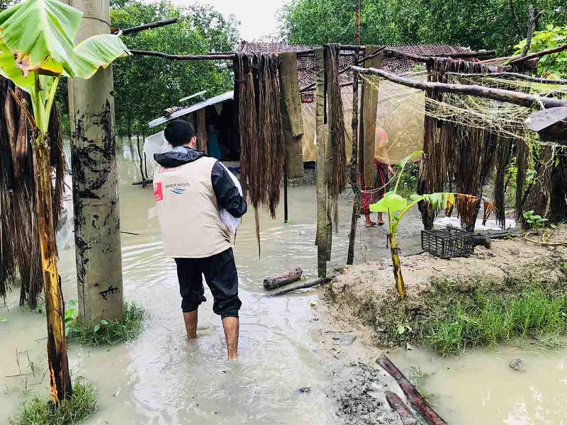 新型コロナウイルス感染拡大に留意し、密集を避けるため、被災者の方の自宅を一軒一軒訪問して物資の配布や啓発活動を行いました。サイクロン上陸後も被災地では悪天候が続いており、足場の悪い道や小舟に乗らないとたどり着けない場所もありましたが、そういったところへも物資を届け、啓発を行いました。