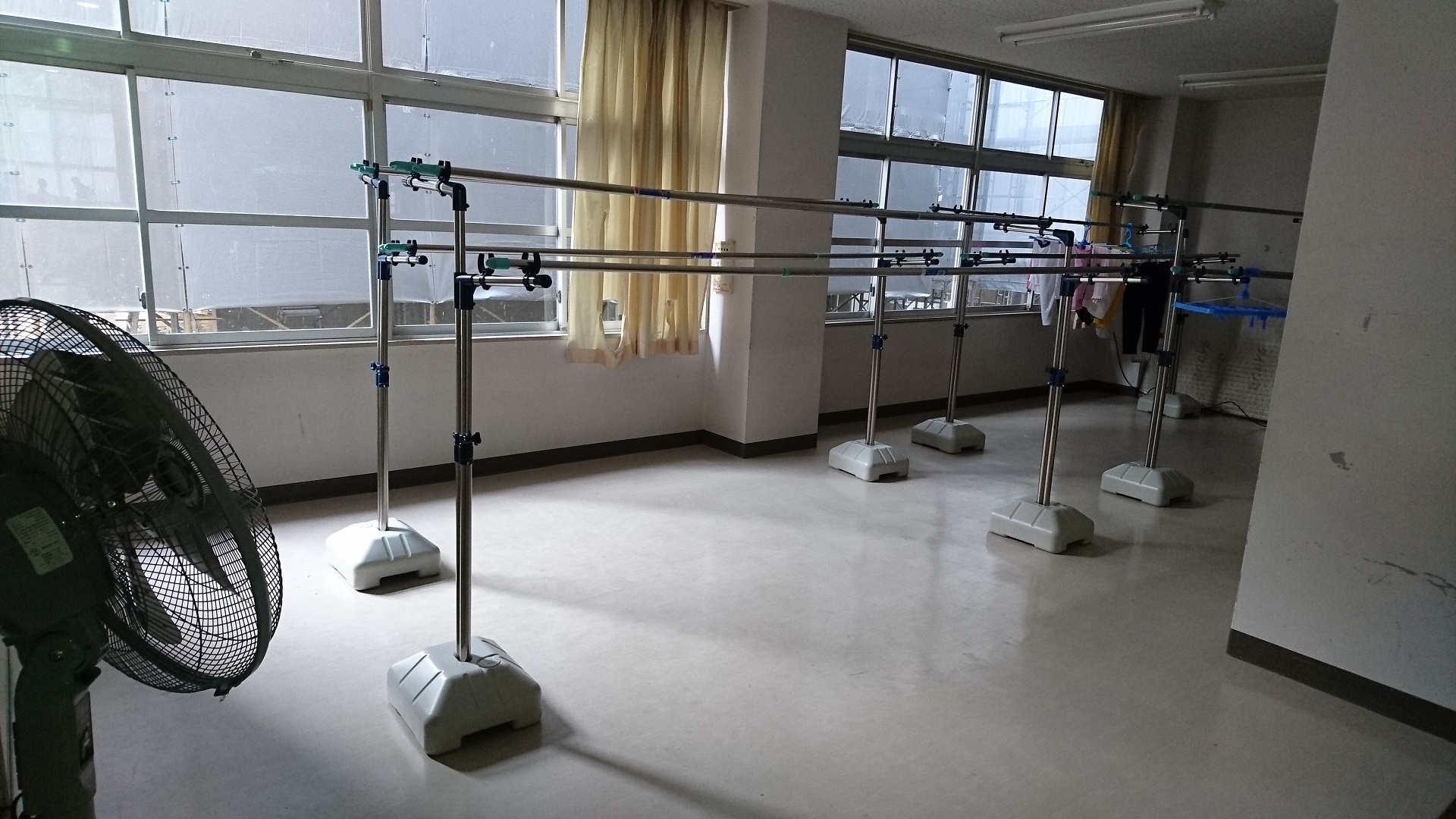 PWJのスタッフは7月6日からレスキュー活動や支援物資の配布を開始。7月18日からは杷木中学校にスタッフを常駐させ、住民からの聞き取りや現場の状況を通して衛生面や利便性に関する課題を洗い出し、様々な改善策を提案・実施しています。これまでに、食事・交流スペース、物干し場、ゴミ捨て場、衣類置き場、受付を整備したり、テレビや乾燥機などの生活家電を設置したりしました。