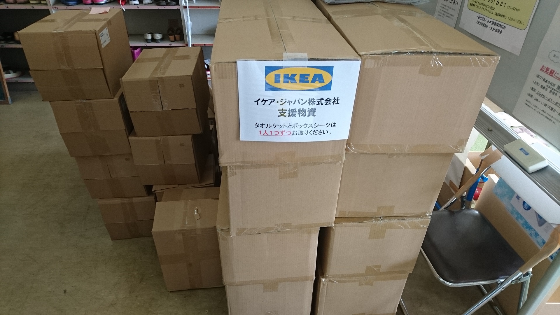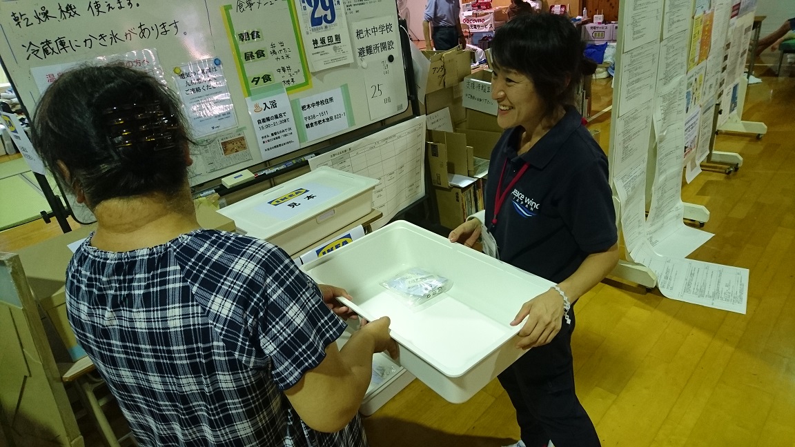 また、PWJのネットワークを生かし、支援物資のニーズを企業につなげたり、企業ボランティアを受け入れたりもしています。住民からの要望を受け、イケア・ジャパン株式会社からは寝具や日用品、マースジャパンリミテッドからはお菓子を無償提供していただきました。佐賀に本社がある株式会社ミズからは、薬剤師を含むボランティア2名を継続的に派遣していただき、避難所運営をサポートしていただいています。