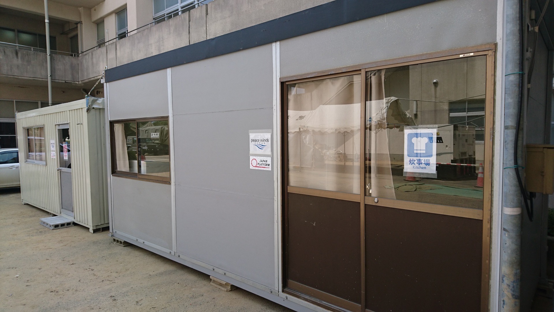 杷木中学校には屋内の調理スペースがなく、砂ぼこりが舞う屋外で住民が調理をしていたため、PWJがエアコン・冷蔵庫・シンクを完備したユニットハウスを新たに設置し、炊事場として活用しています。同時に、急病人が出た際に看病する救護所用ユニットハウスも設置しました。