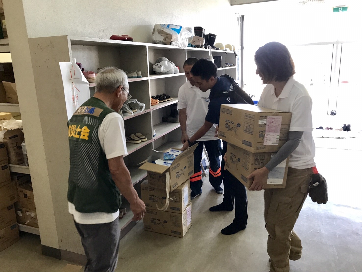 PWJスタッフはこの日午前、サンライズ杷木の避難状況を視察。洗濯物を細いロープで干していたこと、授乳スペースとして使われていた体育館2階が周囲から丸見えだったことなどから、改善の必要性があると判断しました。避難者たちに話を聞いたうえで、この日のうちに物資を調達して避難所に届けて設置しました。また、杷木中学校や久喜宮小学校の避難所には、首元を冷やす冷却剤を計267個配りました。