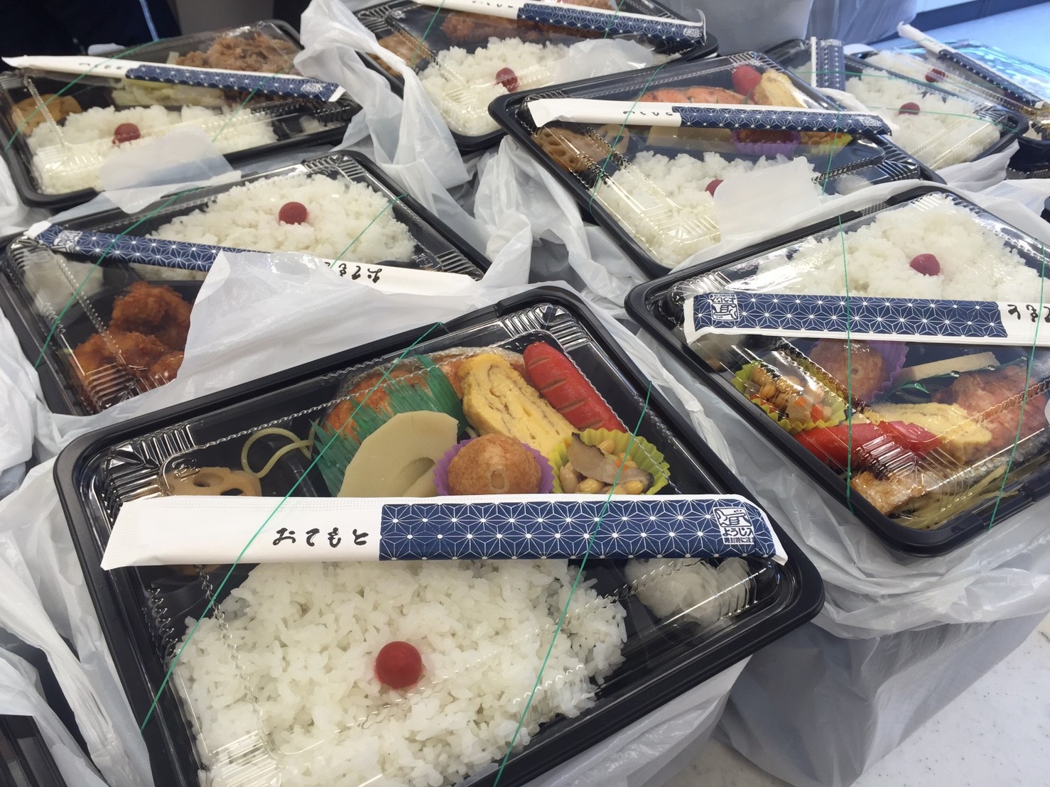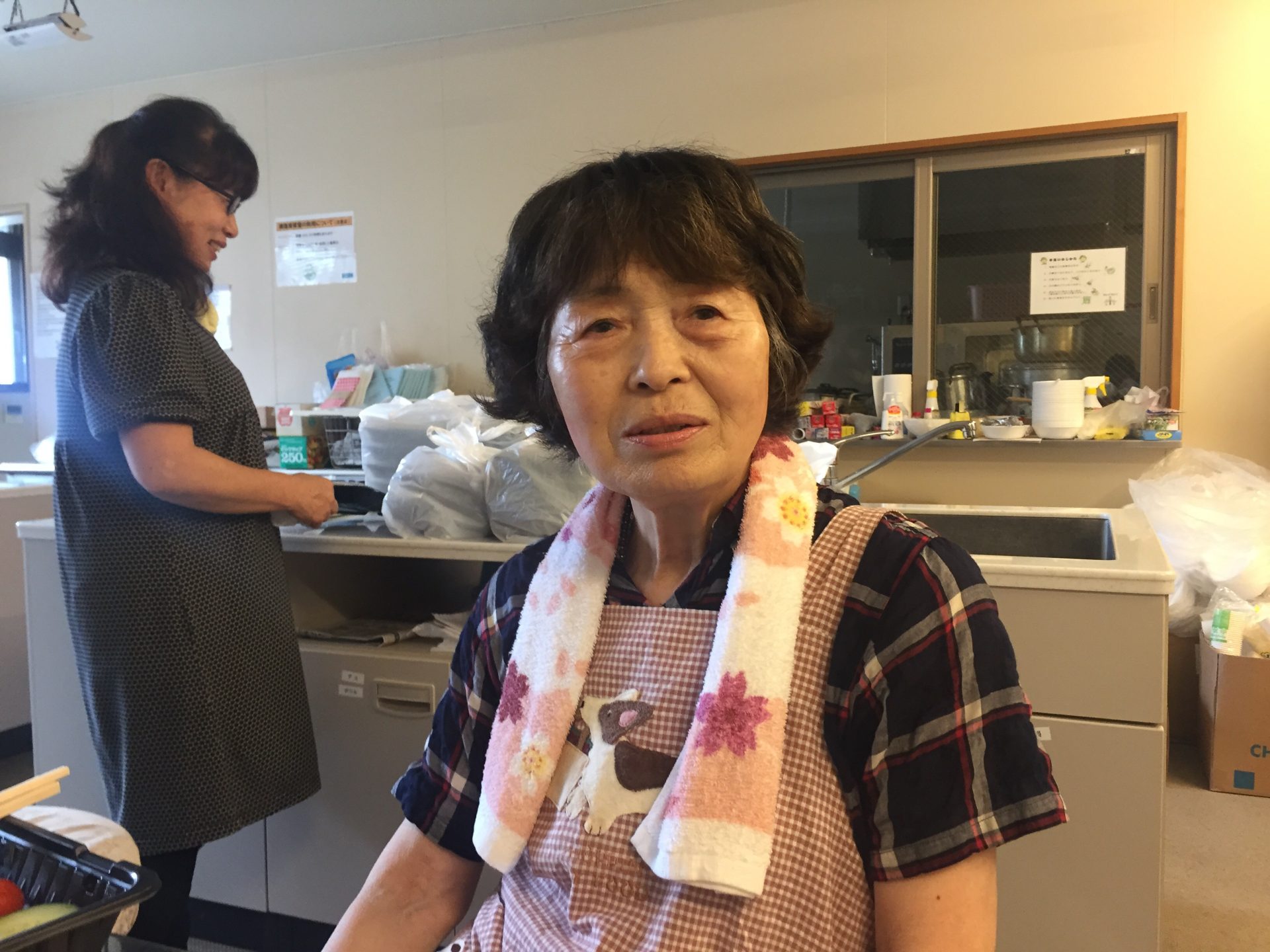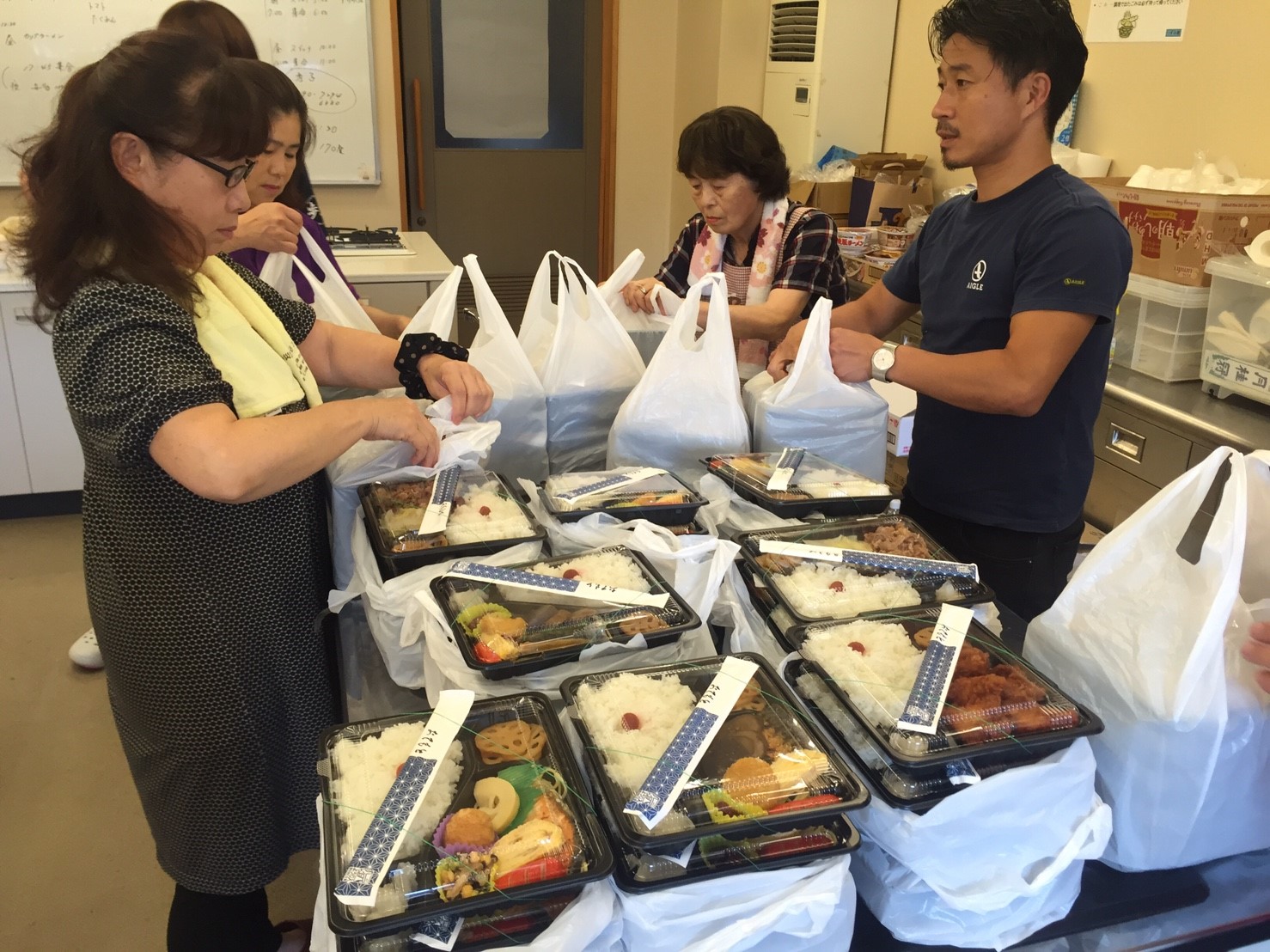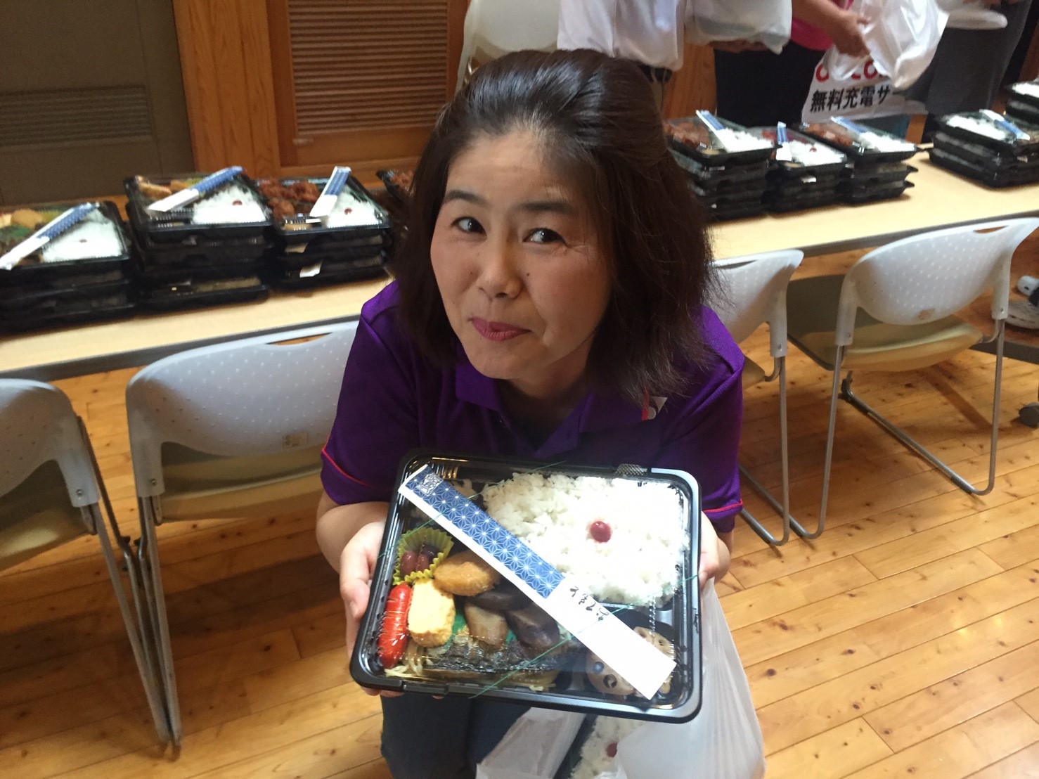車は昼前に避難所に到着。3団体のスタッフたちが弁当を運び込み、笑顔で集まってきた避難者たちに170食分を配った。ここに避難している坂本康子さん(76)は「お漬物ばかり食べていたので、こんなに美味しいものを食べて胃がびっくりしている。今日はお昼ご飯を作らなくて良いので気が楽です」と喜んでいた。