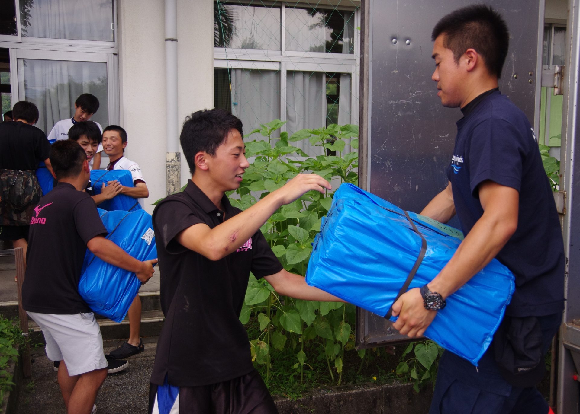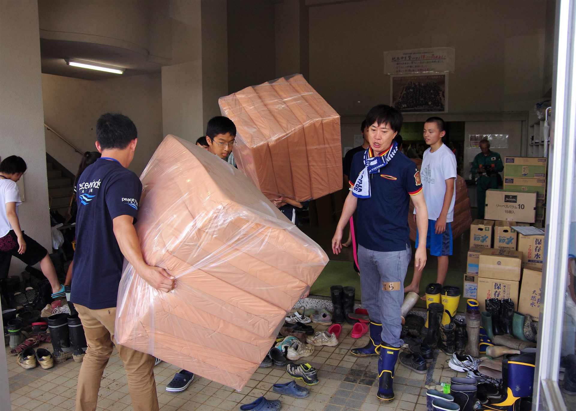 【写真説明】杷木中学校にマットレスを運び込むPWJスタッフたち