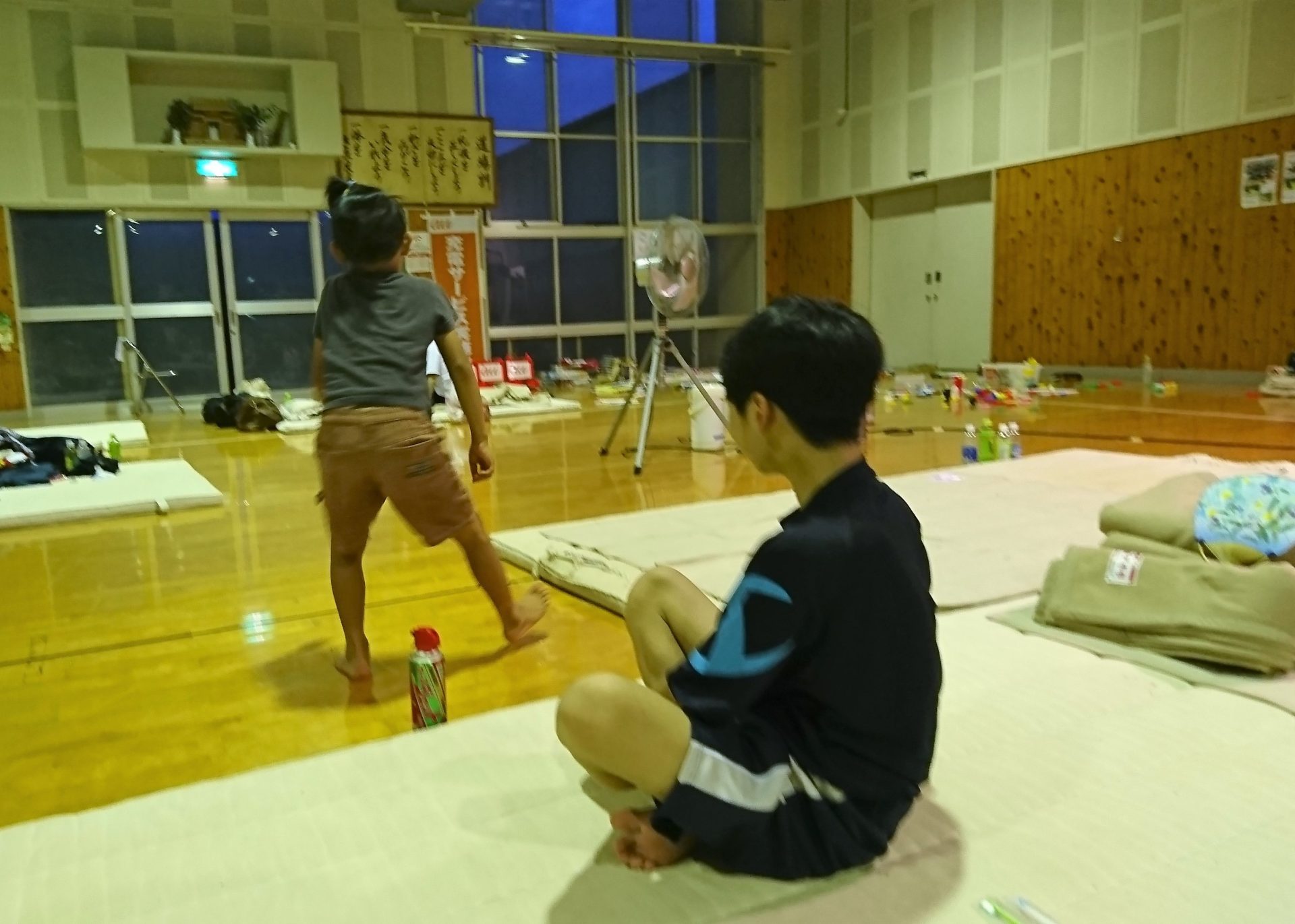 杷木中2年の岩下優生君(13)は避難して3日目。「体育用のマットだけん、硬くて寝づらい。どうしても眠れないときは、少ない毛布を借りて下に敷いてる」と話す。自宅は、多くの家屋が土砂崩れや川の氾濫によって流された地域にあるという。「膝の上まで水が押し寄せてきて、『もう危ない』ってお母さんたちと逃げてきました。こんな雨が降ったのは初めて。怖かった」と当時の状況を振り返った。PWJは8日午後3時過ぎ、三井化学株式会社から寄付を受けたマットレス100枚を岩下君が避難する体育館に運んだ。マットレスに寝転がった岩下君は「ふかふか。今日からぐっすり眠れそうでうれしい」と喜んでいた。