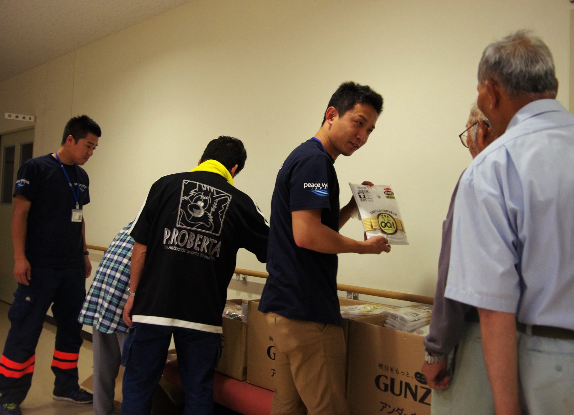 「着替えがほしい」という声にも、パートナー組織の災害支援団体シビックフォースなどと連携して対応した。グンゼ株式会社からシビックフォースに寄付された肌着計1800枚を、市内の3カ所の避難所(フレアス甘木、久喜宮小学校、杷木小学校)に配布。2枚を受け取ったフレアス甘木に避難する藤本公子さん(88)は「着替えば一枚しかもってきとらんかったですけん、ありがたかです」と笑顔。当初は杷木地区の松末小学校に避難していたが、体育館まで濁流が押し寄せてきたため、自衛隊のヘリに助けられたという。逃げる際にずぶ濡れになり、その服のままで3日間過ごしたといい、「着替えの支援物資は初めて」と喜んだ。藤本さんの知り合いによると、藤本さん宅は濁流に押し流された。今回の豪雨災害では、藤本さんのように自宅を失った被災者もいるため、避難が長期する恐れがあり、今後も衣類などのニーズは高いと実感した。