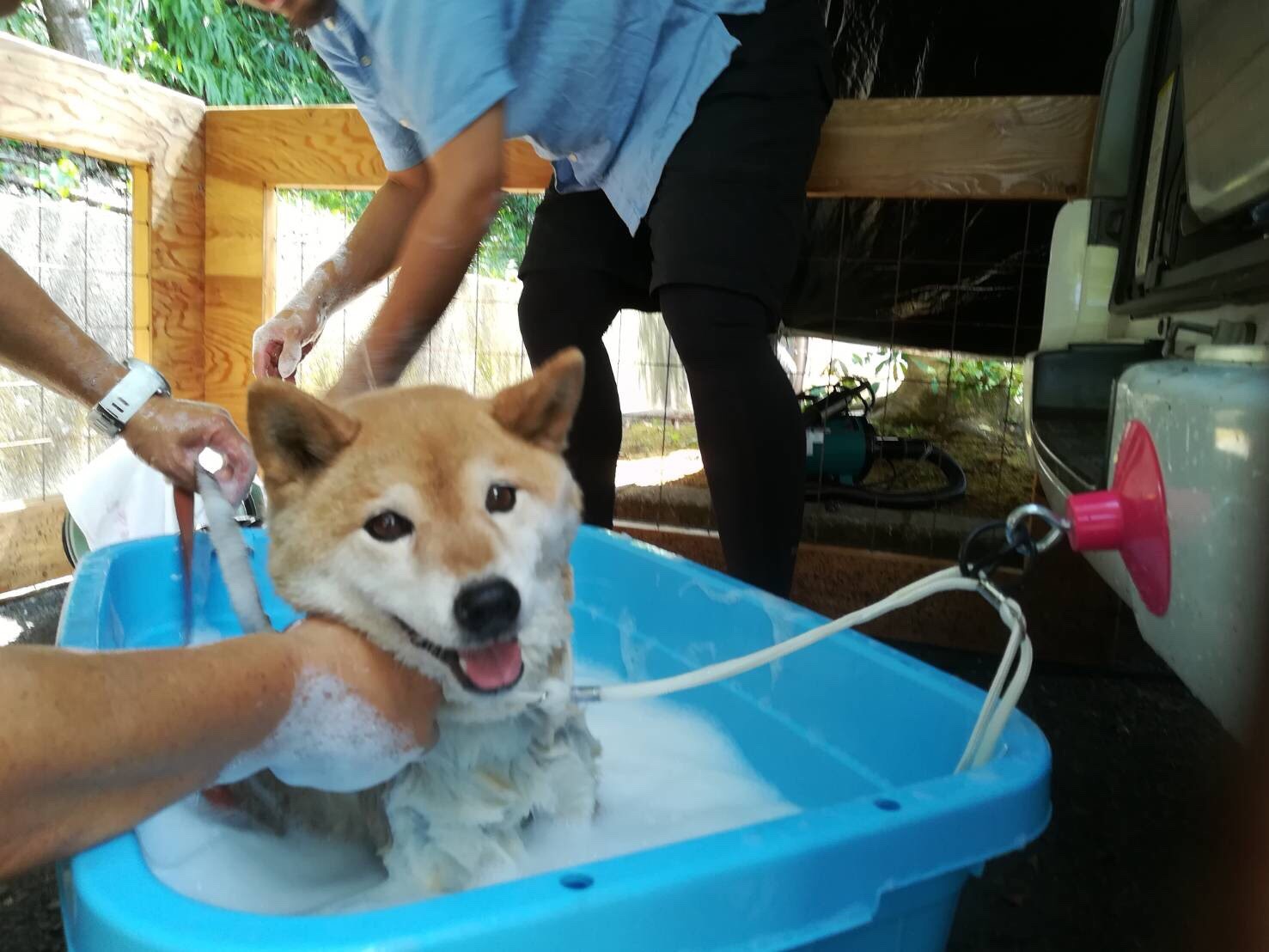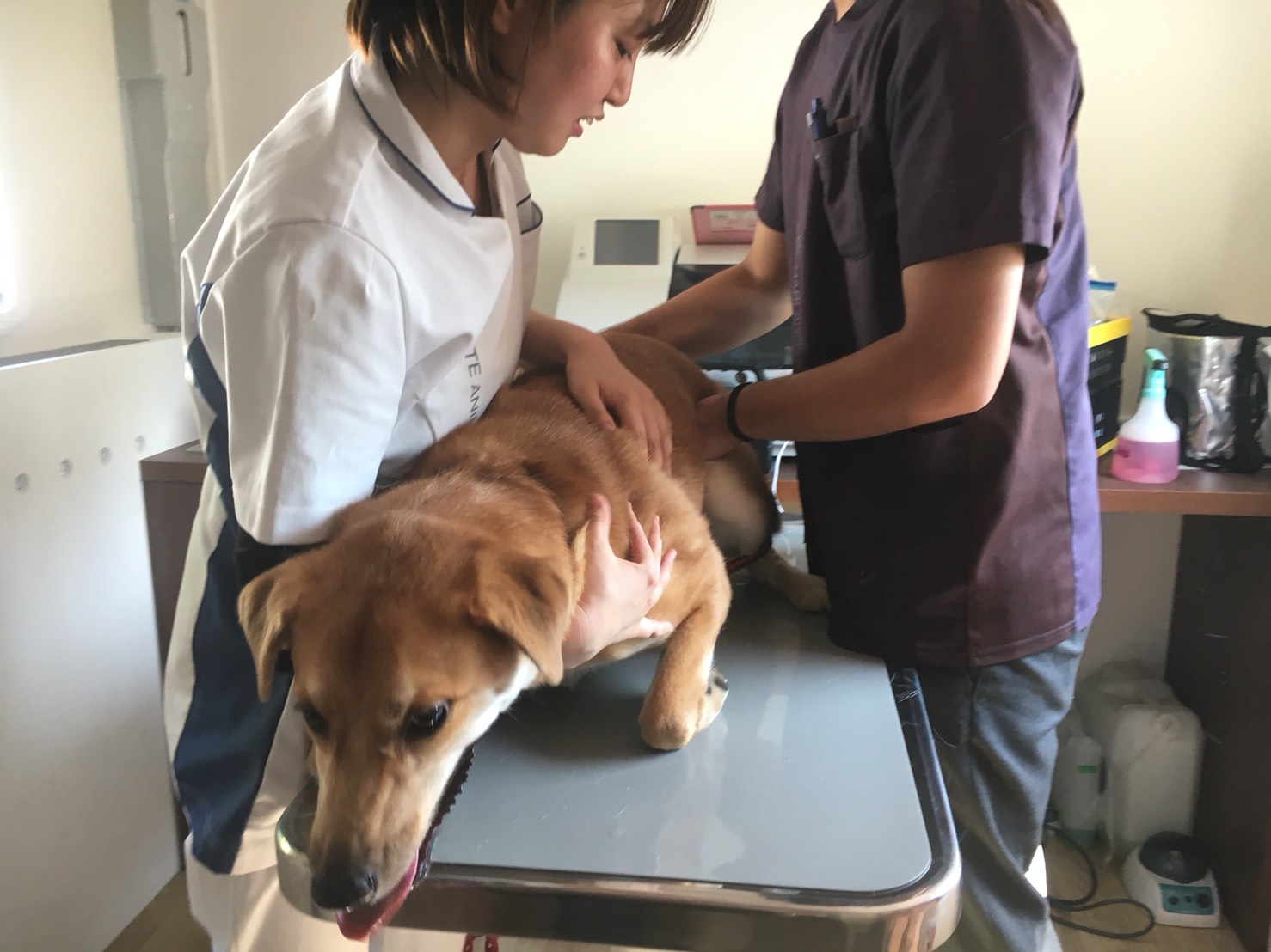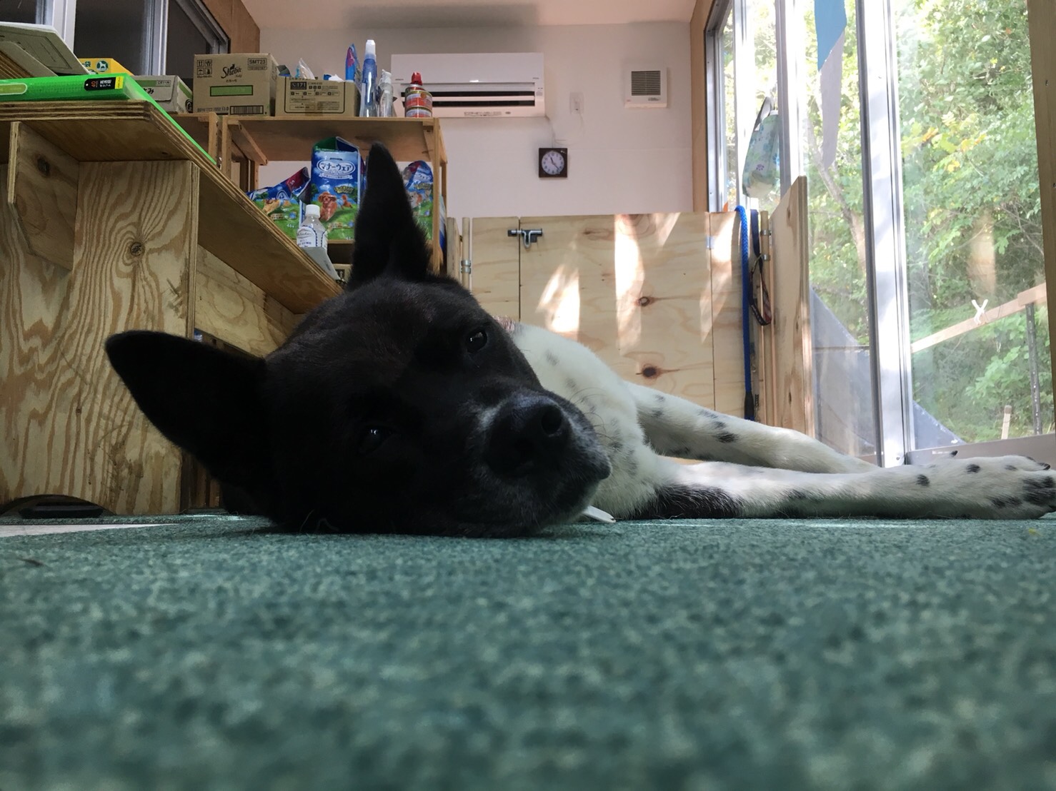毎日来られた皆勤賞は、大型犬雑種のポポ君。ポポ君は自宅外で飼われ、当時浸水する水の中を泳いでいるところを助けられました。今でも雨の日は怖がります。飼い主さんが車も失った為、ポポ君はボランティアさんたちが交代で、毎日送り迎えをしています。通い始めた頃は、大きな声でずっと吠えている状態だったが、多くの人が彼の世話に携わることで人懐っこさが増し、大きなサークルの中で安心して横になることもできるようになりました。ポポ君のご家族は仮設住宅への入居が決まっているが、仮設住宅が狭く、外での飼養が許可されていない為、今後のポポ君の飼養環境を検討する必要があります。訓練士を含めみんなで、トレーラー内に入れて室内生活やケージに入るトレーニングをし、室内で落ち着いて伏せていることもできるように。早くポポ君と飼い主さんが一緒に安心できる暮らしができるようにと願っています。