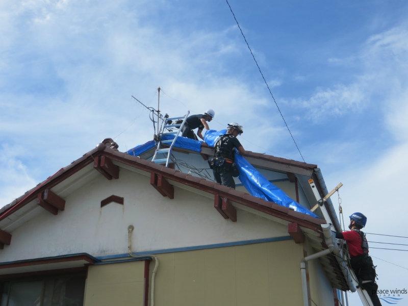 PWJは、台風15号発生直後から千葉県南部に要員を派遣し、鋸南町を拠点としてボランティアセンターの運営を支援する中で、特に破損した屋根にブルーシートを張る支援の調整を行ってきました。ボランティアセンターが調整する技能ボランティアに加え、県が調整する自衛隊、消防、建設業協会と連携しながら数百件のご自宅にブルーシートを張り支援を実施してきましたが、強風被害、台風19号による影響と、一度張ったブルーシートの張り直しが必要な状況が発生しています。被害家屋が多いため、業者による屋根の修理が追い付かない中で、ブルーシートによる一時的な補修の需要は依然高い状況です。
