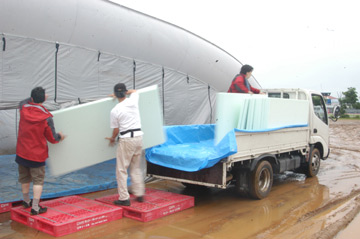 断熱板は硬質の発泡素材を使ったもので、大きさは約1.8m×0.9m、厚さ約5センチ。うち300枚はPWJが購入。700枚はPWJの協力で柏崎市が購入し、PWJが配布・活用を任されていました。当初、主に更衣室用のスペースづくりや家族間の間仕切りとして活用する予定でしたが、体育館などの固い床に直接毛布やござを敷いて寝泊りしている被災者も多かったことから、床敷きとしても使っていただくことにしました。