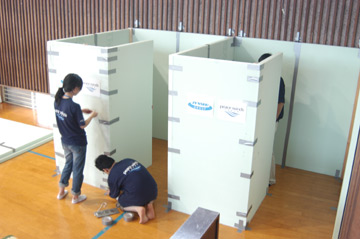 また、柏崎市の松浜中学校と刈羽村の3カ所の避難所では、断熱板を活用した更衣室を計6基設置しました。避難所生活が長くなるにつれ、着替えや授乳のためのスペースが限られていることは、苦痛となりかねません。いくつかの避難所では、テントを更衣室として使用していましたが、数が足りない、階段を登らなければ更衣室に行くことができず高齢の方には不便である、などの課題がありました。更衣スペースの設置で、被災者の不便や苦痛が少しでも和らぐことが期待されます。松浜中学校では、更衣スペースの設置後に屋外の仮設トイレが故障したとのことで、PWJが設置したスペースにポータブルトイレを置き、トイレとして役立てていました。