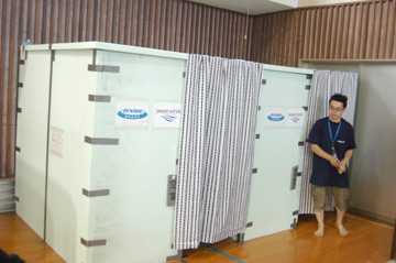 新潟県中越沖地震の被災地で支援活動を行っているピースウィンズ・ジャパン(PWJ)は、床敷きなどに使うためのたたみ状の断熱板を柏崎市や刈羽村の避難所に配布してきましたが、24日までに約1000枚の配布を完了しました。床に敷くマットとして多くの被災者に利用していただくほか、4カ所の避難所ではこの断熱板を使って更衣室や授乳室用のスペースを組み立て、活用していただいています。