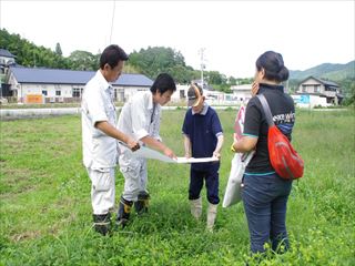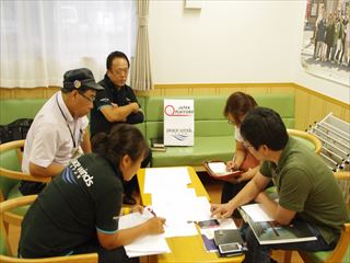 ▲写真左:会合に参加した住民有志、写真右:住民に説明するPWJ西城