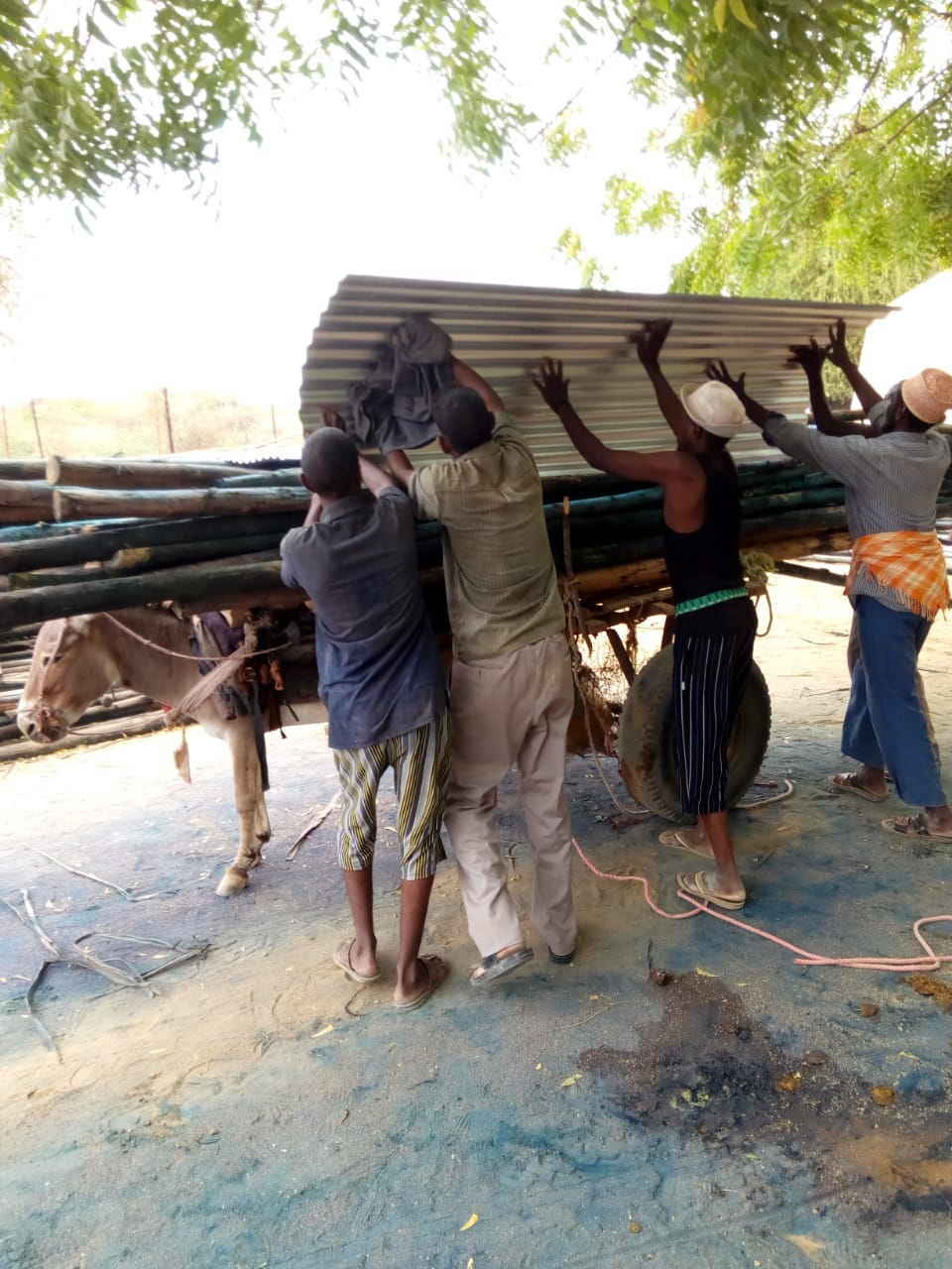「仮設住宅の建設資材を、今ロバの荷車に積んでいるところです!」
