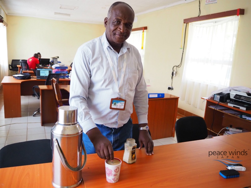 ちなみに、ケニア人はデスクワーク中に紅茶・コーヒーをよく飲みますが、この紅茶・コーヒーは皆さんがイメージする味とは異なるかもしれません。ティーバッグ・コーヒーに少量のお湯、たっぷりの温めたミルクと大量の砂糖を入れるのがケニアンスタイルです。例えば、写真に写っている最年長のジェフリーは砂糖をスプーン3杯分いれていました。(甘いものが得意でない私は1杯弱でギブアップ)