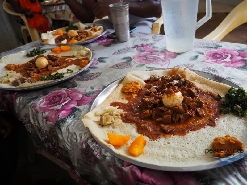 事業地から戻った後は、ランチタイムです。いつもはキッチンに向かい、PWJのシェフが作ってくれたケニア料理を食べますが、この日は女性スタッフのアリスたちがカクマ難民キャンプにあるエチオピア料理屋へ連れていってくれました。実は人生で初めてのエチオピア料理。まさか難民キャンプの中で食べることになるとは思いませんでしたが、非常に美味しかったです。