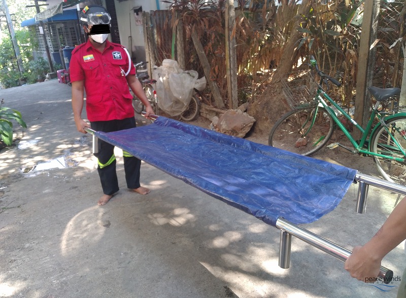 今回救護にあたっている市民グループは昨年来のコロナ禍によりコミュニティーの中に組成されたチームで、あらかじめ応急処置の基礎訓練を受け、現在、市民の救護を行っています。今回の支援では、ヤンゴン地域の7地区で8つの市民グループに対し、負傷者の緊急手当用に担架や応急処置キットなどを配布しました。