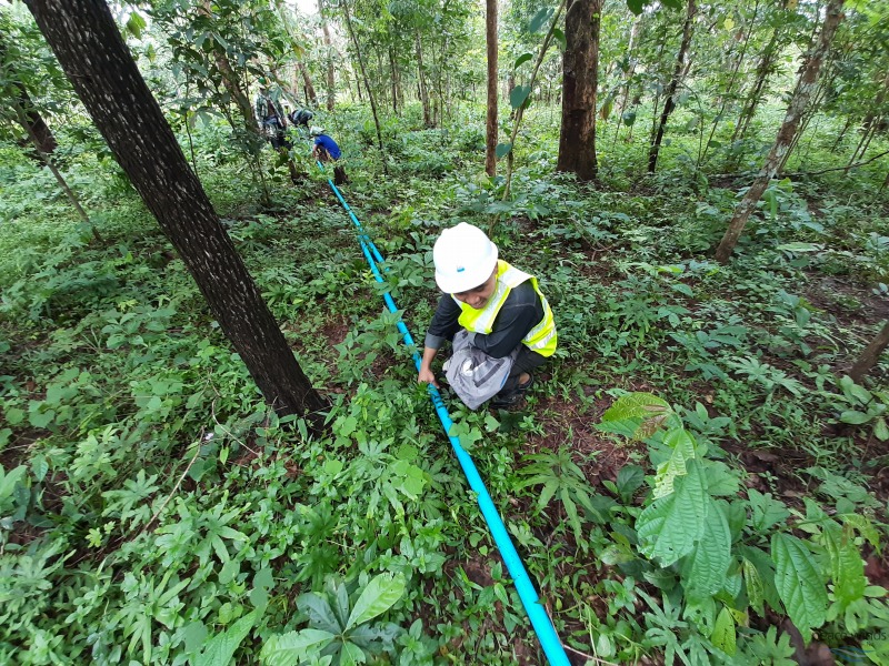 自然流下方式による水供給システムは、まず丘陵地の湧水に堰を設けて取水し、そこから斜面の高度差を利用して送水し、村内に貯水槽を設けて各世帯へ配水するシステムです。事業では、送・配水管の計画地点に沿って測量を実施し、十分なデータ解析に基づいてパイプラインを敷設し水を供給するわけですが、実際の事業実施に当たっては取水地点の決定からパイプラインの敷設経路に関することまで村人の間でさまざまな意見が絡み、また歴史的にも対象地域は国境地域でもあり、長年に亘り紛争が絶えなかった地域ですので、村にもさまざまな背景を有する住民がそれぞれの立場で生活しており、意見をまとめることはなかなか一筋縄ではいきません。