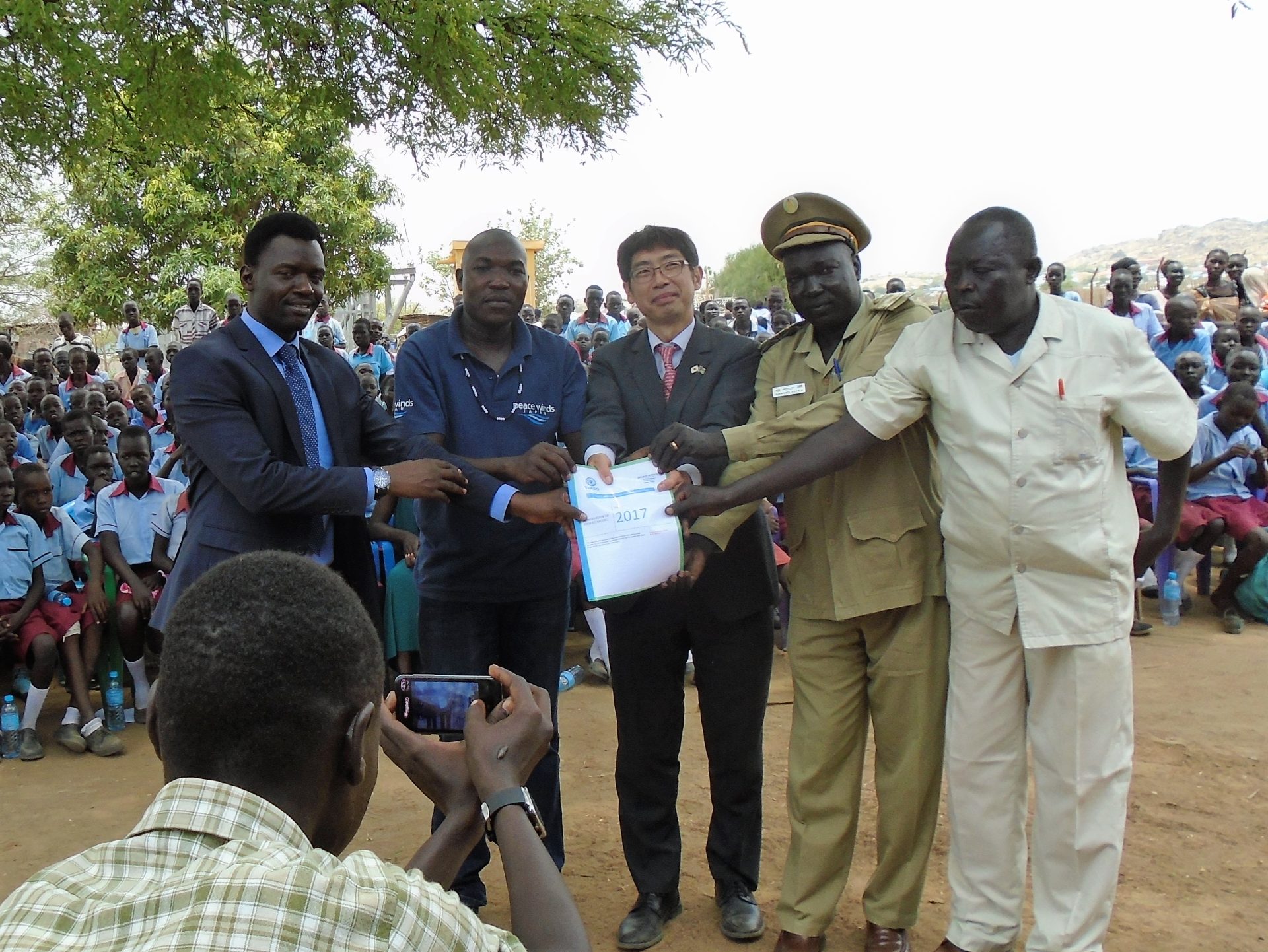 【写真説明】小学校トイレが完成した際のセレモニーの様子/南スーダン国内で実施する衛生普及活動の様子