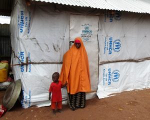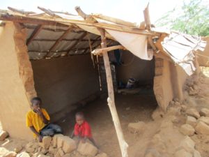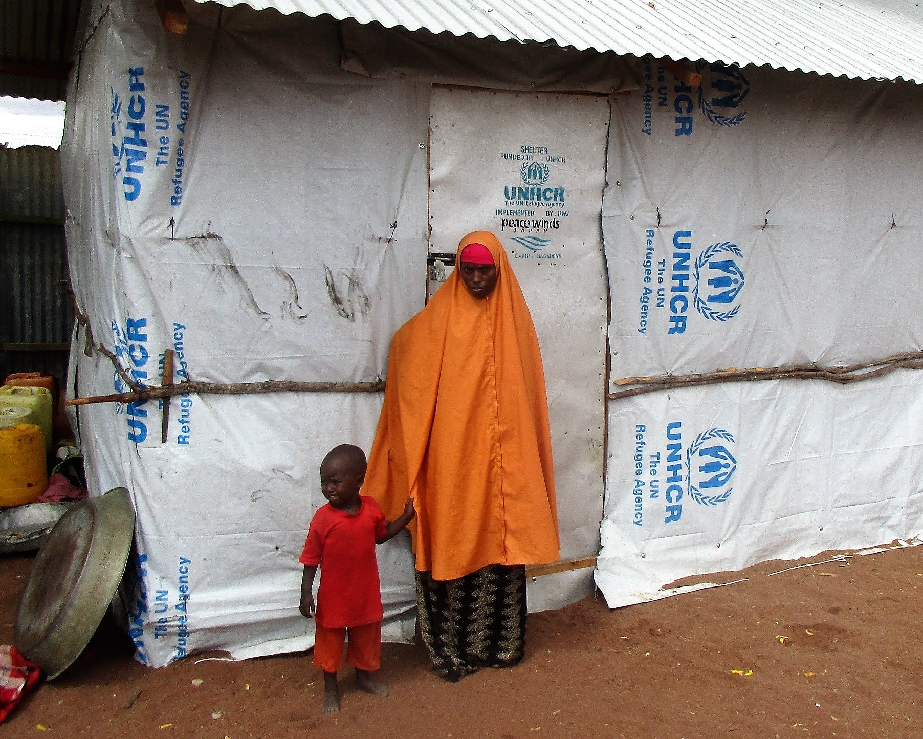 【写真説明】自宅のシェルター前に立つソマリア難民のお母さんと子ども/壊れたシェルターにたたずむ子どもたち
