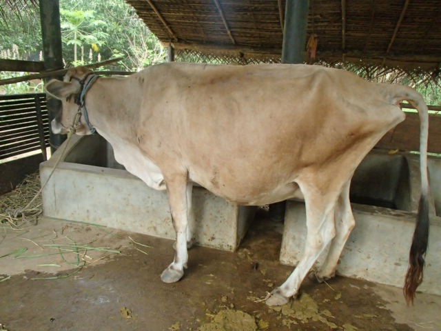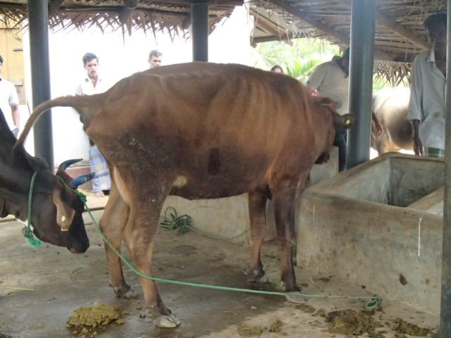 2014年2月20日、トリンコマレ県ムトゥール郡で行われているPWJの酪農事業を見学しました。JICA事業のために駐在している日本の畜産専門家と獣医師が、同事業の飼料の妥当性や飼育方法の問題点を見つけ、搾乳量を増加させるために助言をする視察に、私も同行しました。最初に訪ねたのはPWJが支援するコア・ファーマーの中でも模範的な酪農家で、餌場が非常に衛生的でした。飼料の種類と量、毎日の搾乳量もしっかりと記録されていました。しかし、満足な搾乳量が得られず利益が少ないとのことです。畜産専門家は、1日3回の餌を毎回変えるのではなく、3食とも同じものを与えた方が胃の負担が少ないとアドバイスされていました。