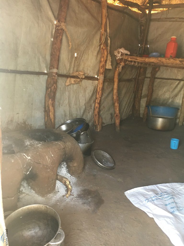 次にご紹介する写真は、ある家庭の台所です。左手前には、土や泥を練って作った手作りのかまどがあります。かまどの上に鍋を置き、近くの藪から集めてきた薪で火をつけ、調理しています。鍋やボウルなど、基本的な調理用具は各家庭にキットとして配られます。なお、このかまどの中に見える白い粉のようなものは灰ですが、みなさん、この灰をこの後どうしているかご存じでしょうか。実はこの灰、この後も用途があるのです。私もウガンダで初めて知りましたが、灰は人類最古の洗剤と言われ、灰を煮詰めた灰汁を材料として石鹸を作ることができます。難民居住地区では定期的に固形石鹸が配給されるのですが、手洗いから食器洗いから洗濯から掃除まですべて固形石鹸でするため、すぐなくなってしまうため、灰から石鹸を作っている人もいます。
