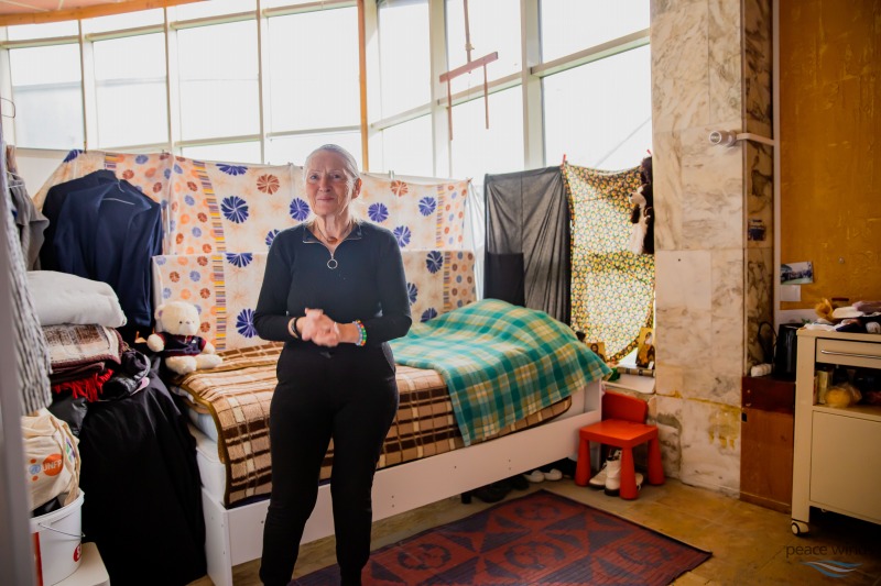 シネマ避難所に暮らしているラリーサさんはウクライナ首都のキーウからやってきました。シネマ避難所ではちょっとした有名人のおばあちゃん。気難しい性格もあり他の避難民からは少し煙たがられることもあるようですが、とにかくお節介焼きで根が優しいラリーサさんは、いつもピースウィンズスタッフを気遣ってくれます。