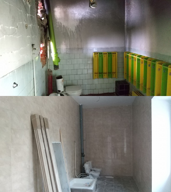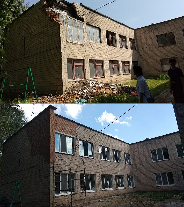 ミサイル攻撃を受けた第72幼稚園の外壁。上が改修前。下が改修後