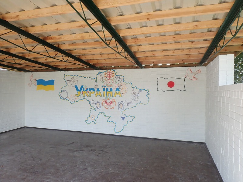 第4幼稚園では、改修した屋外のキャノピーに壁に、ウクライナの地図や国旗とともに、ハトと日本の旗が描いてありました。